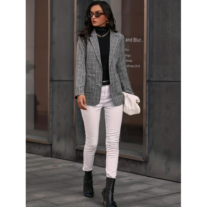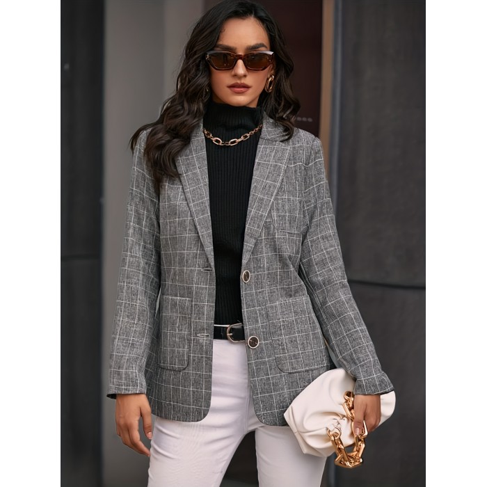 Plaid Print Single Breasted Lapel Blazer, Elegant Patched Pockets Long Sleeve Blazer For Office & Work, Women's Clothing